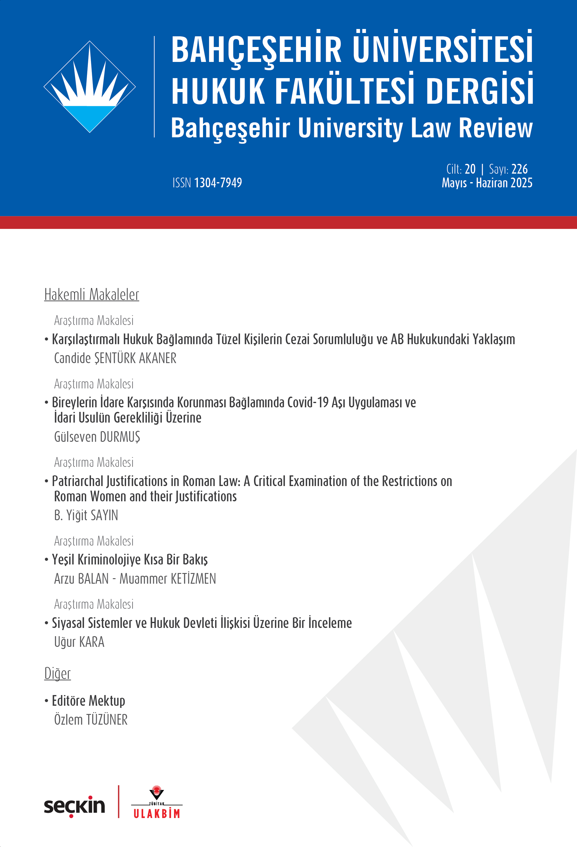 Bahçeşehir Üniversitesi akademisyenleri tarafından hazırlanan "Hukuk Fakültesi Dergisi" yılda altı kez okuyucuyla buluşuyor. Farklı konularda çok sayıda makaleye yer veren derginin bu ay ki sayısında aşağıdaki makalelere ulaşabilirsiniz.