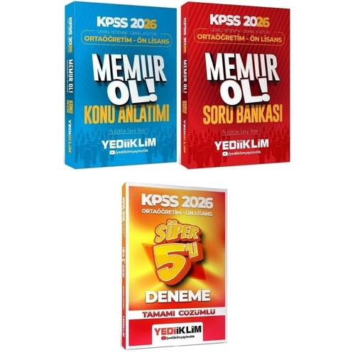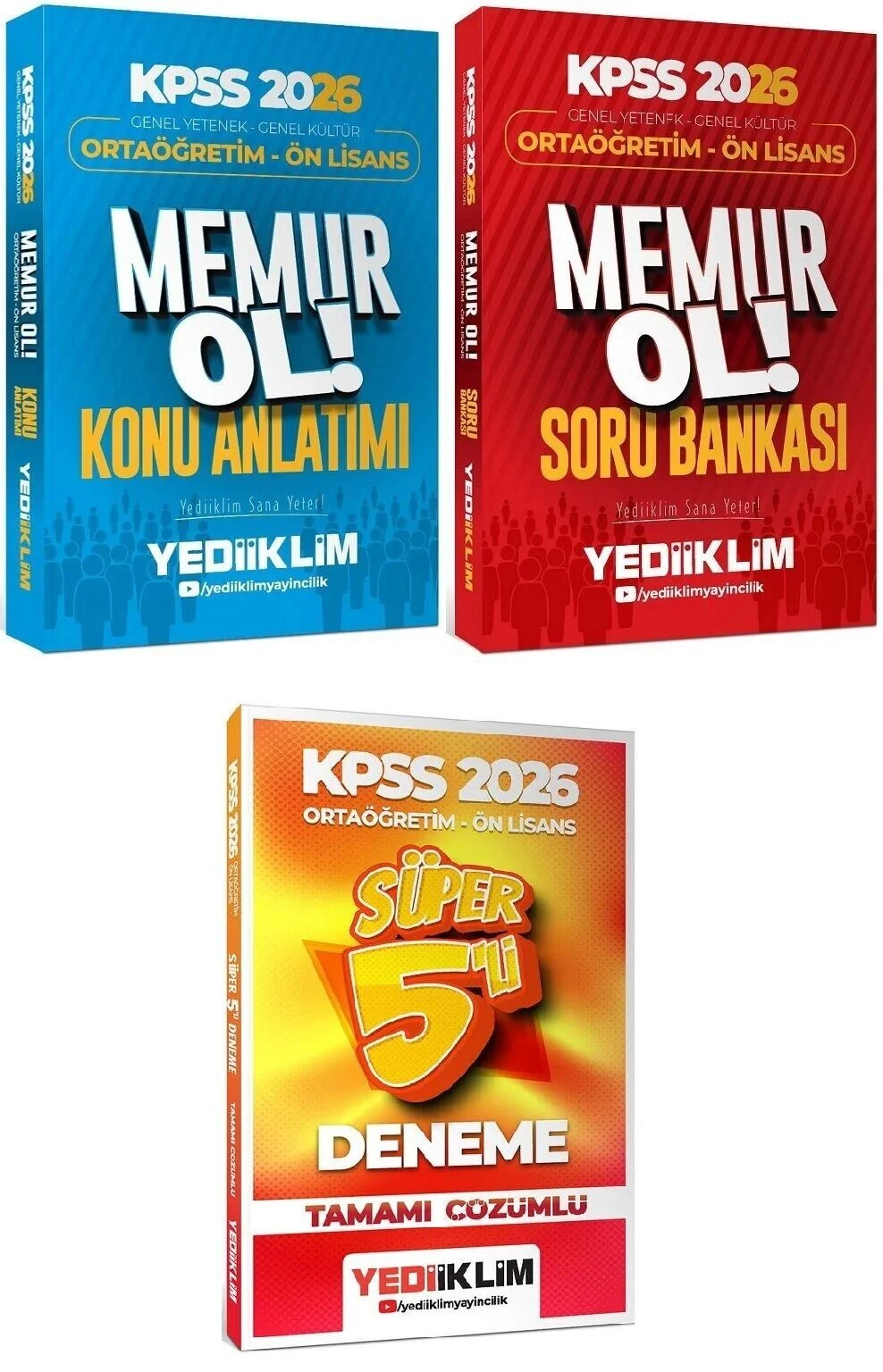 Yediiklim Yayınları 2026 KPSS Lise Ortaöğretim Ön Lisans MEMUR OL Konu + Soru Bankası + 3 Deneme 3 lü Set